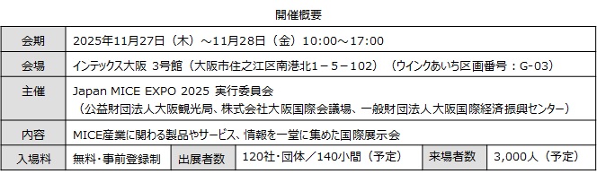日本管財株式会社(本社:東京都中央区、本店:兵庫県西宮市、代表取締役社長:福田 慎太郎、以下「当社」)は、グループ会社の東京キャピタルマネジメント株式会社(本社:東京都港区、代表取締役社長:木村 光男)が、ウインクあいちとして、2025年11月27日(木)から11月28日(金)に開催される「Japan MICE EXPO 2025」 に出展することをお知らせいたします。